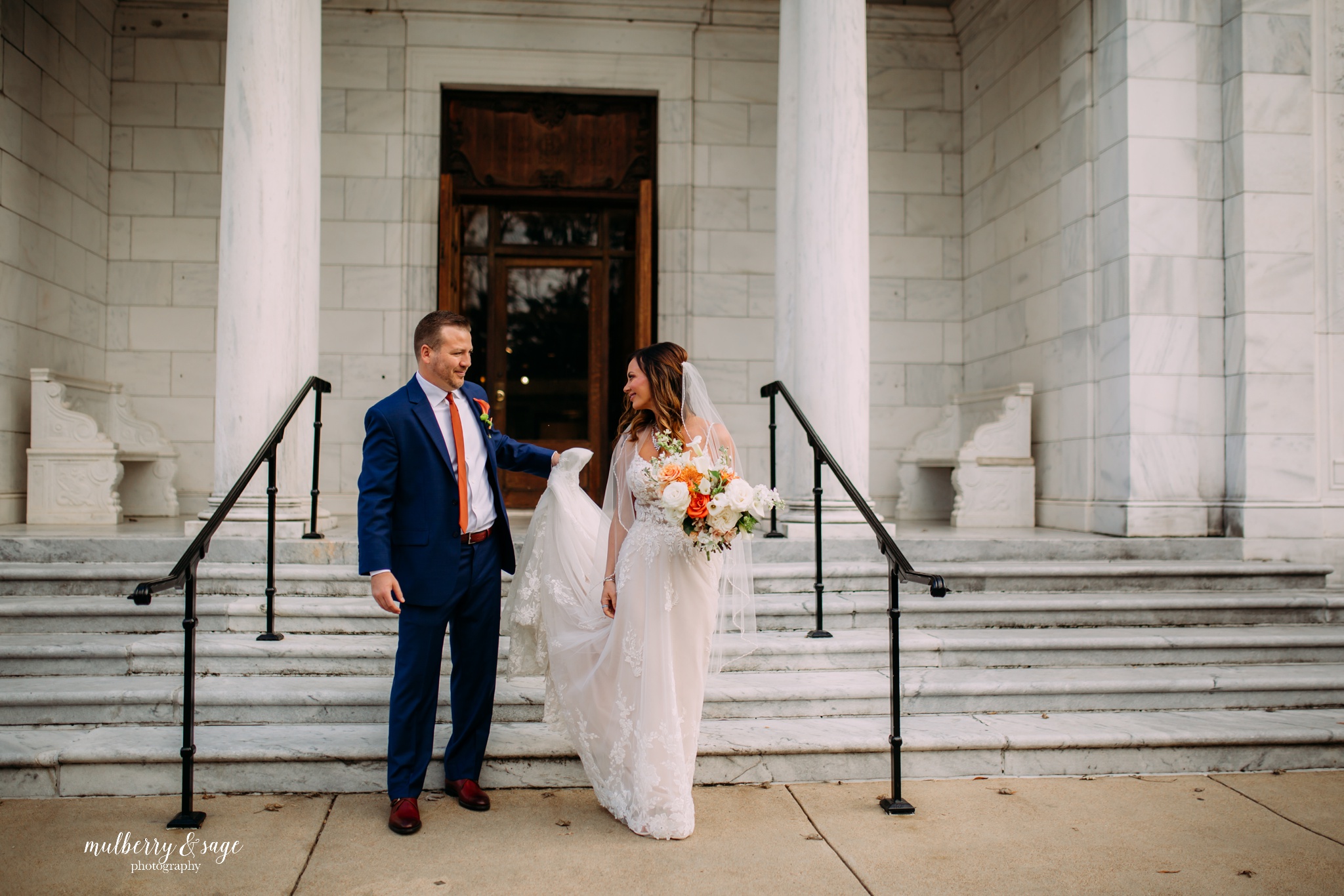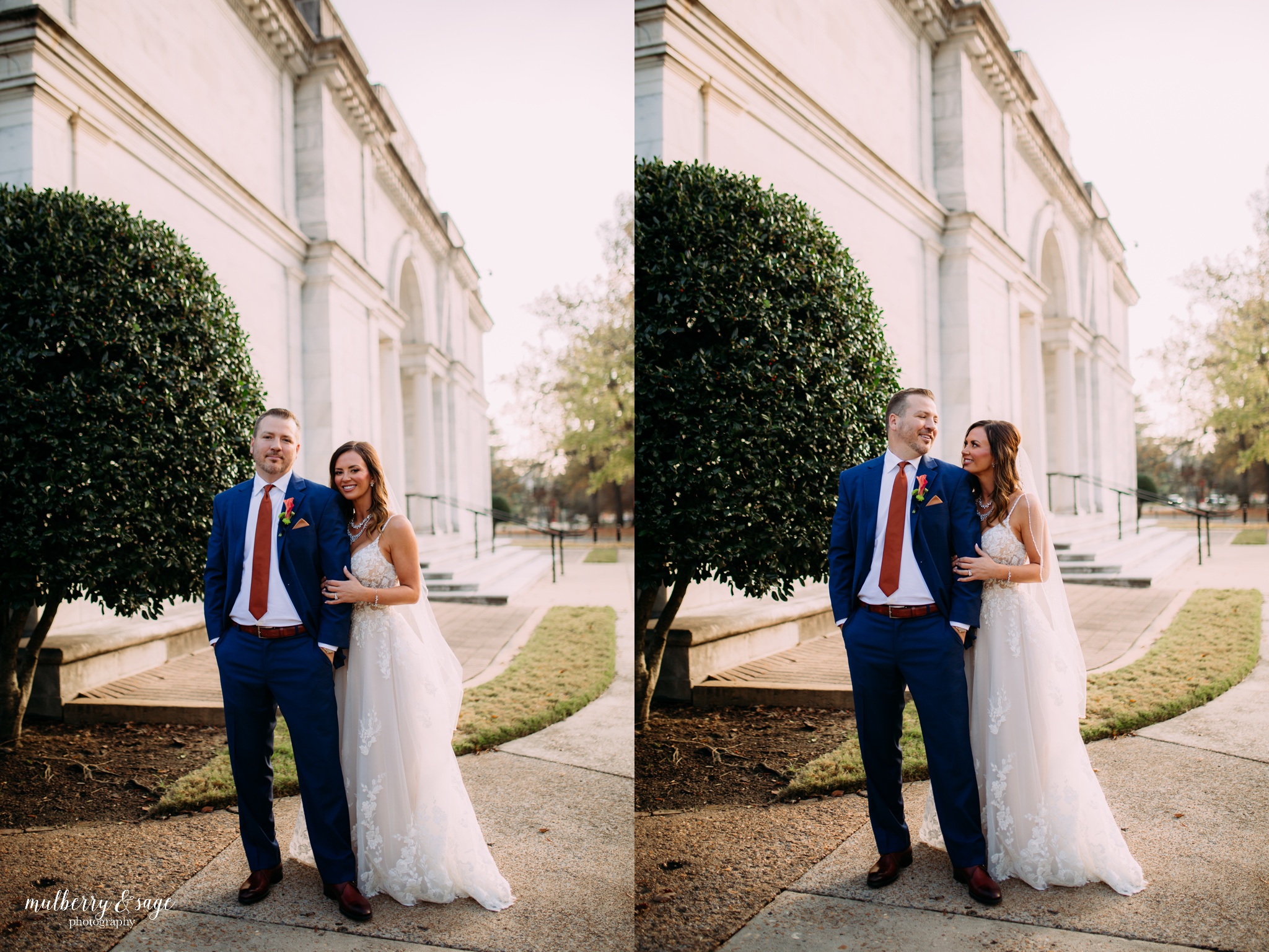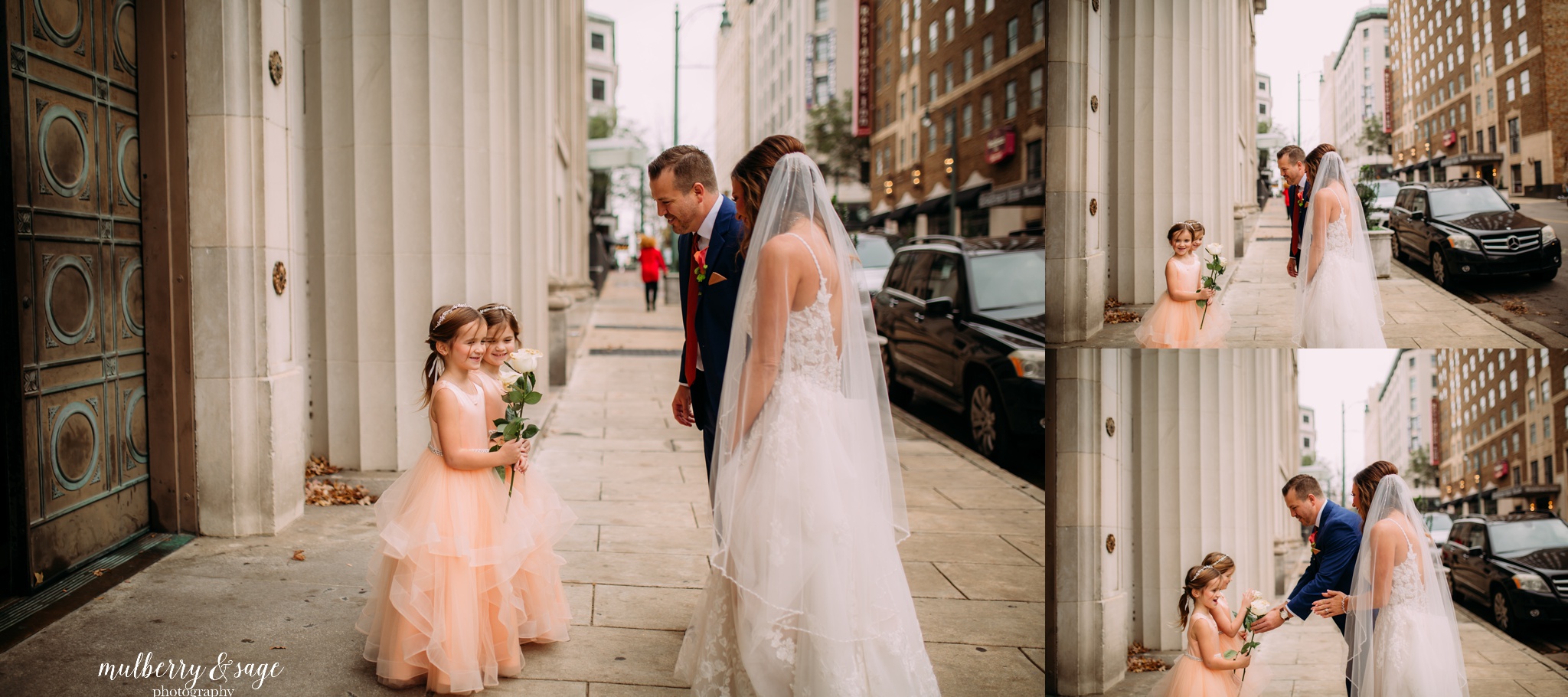 There’s something undeniably magical about weddings in Memphis. Maybe it’s the blend of history and modern charm, or the soulful heartbeat of the city itself—but The Columns elevates that magic to a whole new level. With its soaring marble pillars, sweeping staircases, and timeless architectural details, it was the perfect setting for a wedding that was both stylish and deeply intimate. From the moment guests stepped through the grand entrance, it was clear that every detail of this day had been intentionally designed. The couple chose a rich, perfectly coordinated color palette—warm neutrals with subtle touches of navy and muted tangerine—that complimented the venue’s classic interiors beautifully. Even in such an impressive space, the atmosphere felt warm, inviting, and personal. But what made this wedding truly unforgettable wasn’t just the stunning florals, the glowing candlelit tables, or the incredible natural light pouring through the arched windows. It was the love story at the center of it all—a story of two people joining not only their lives, but their family.